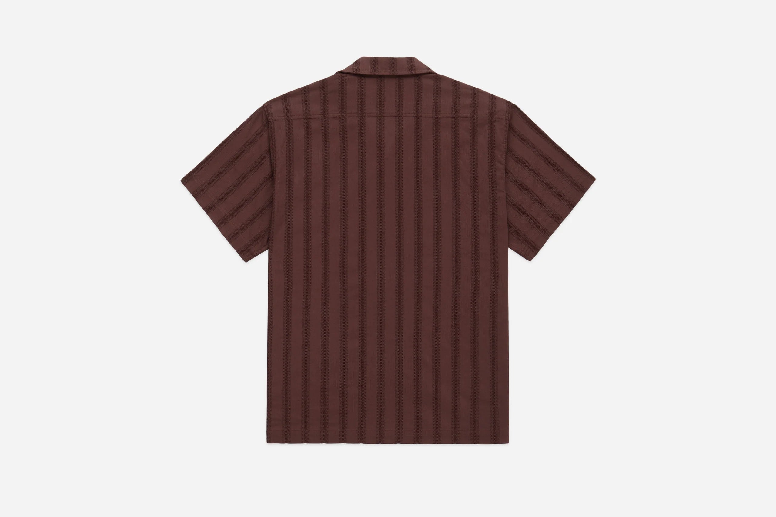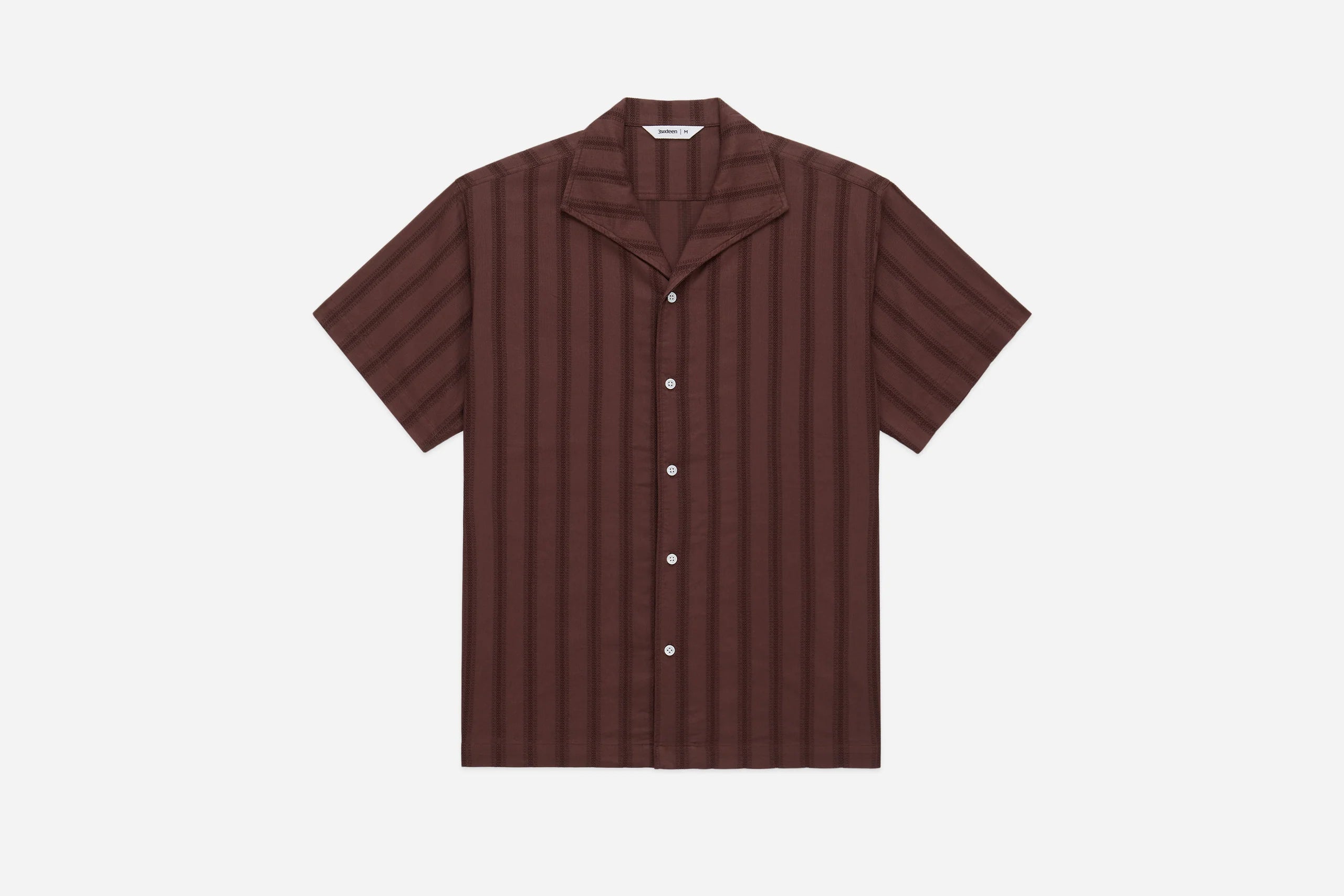 The Leisure Shirt, as crafted by 3Sixteen, is modeled after vintage 1950's open-collar vacation shirts. This iteration utilizes a Japanese striped lace weave with a truly beautiful texture. The shirt is finished with mother of pearl buttons.